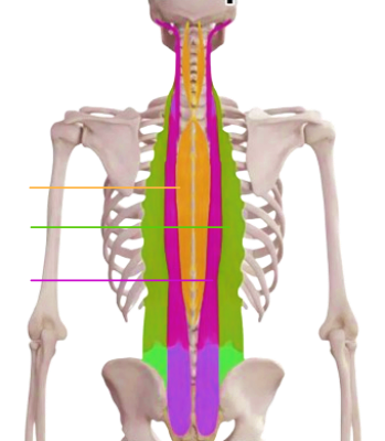- Een lange spiergroep die langs de wervelkolom loopt, van bekken tot schedel.