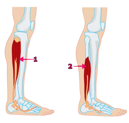 Betrokken spieren: Tibialis anterior (1) helpt bij dorsiflexie (het naar boven trekken van de voet).