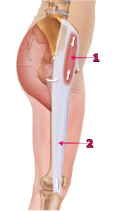 Betrokken spieren: De TFL (1) loopt over in de iliotibiale band (2), een peesachtige structuur die langs de buitenkant van het been naar de knie loopt.