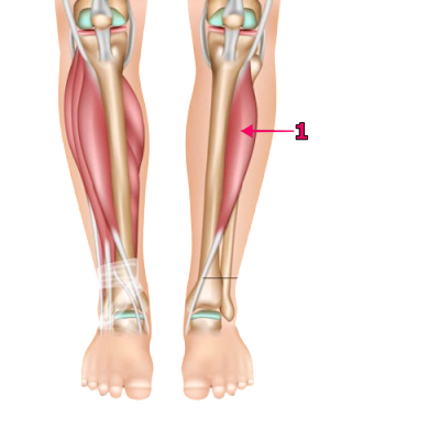 Locatie: De teenbuigspier (2) loopt vanaf het scheenbeen (1) langs de achterkant van het onderbeen naar de onderkant van de voet en de tenen.