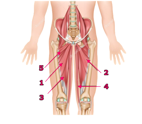 Betrokken spieren: Bestaat uit de adductor longus (1), adductor brevis (2), adductor magnus (3), gracilis (4), en pectineus (5). Ze zorgen voor het naar binnen bewegen van het been.