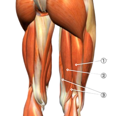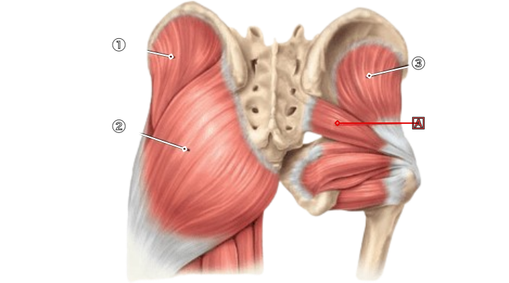 Betrokken spieren: Gluteus maximus(1), gluteus medius(2), en gluteus minimus(3).