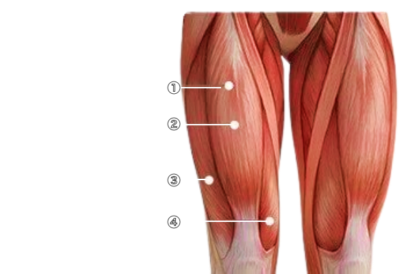 Betrokken spieren: Bestaat uit vier spieren: de rectus femoris(1), vastus lateralis(2), vastus medialis(3), en vastus intermedius(4). Deze spieren strekken het kniegewricht en helpen bij het buigen van de heup.