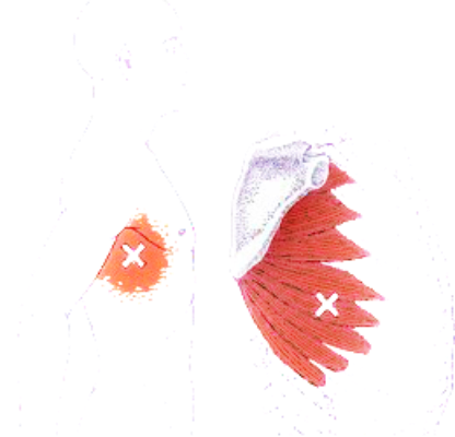 Een strak gespannen serratus anterior kan pijn veroorzaken aan de zijkant van de borst en de bovenste ribben, vaak gepaard met ademhalingsklachten en schouderbeperkingen.